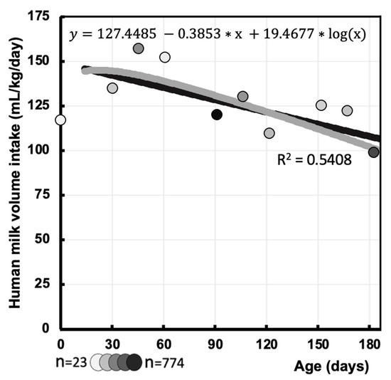In this review, we primarily focused on human milk intake volume during the first 6 months of age. Most of the collected data in this review were from infants up to 6 months of age (predominantly at 6 weeks, 3 and 6 months) and thus matched our primary interest period. The logarithmic regression performed during the primary interest period up to 6 months of age yielded the following function (Equation (2)), as depicted in Figure 7: