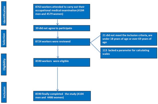 A cross-sectional, descriptive study was conducted on 8590 Spanish workers in the Balearic Islands. The sample consisted of workers who attended their annual occupational health check-up between January 2019 and December 2020 at an occupational health and risk prevention service. This service caters to a range of companies, notably in the healthcare, public administration, hospitality, retail, transportation, education, industrial, and cleaning sectors.