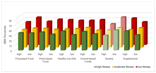 There were no significant interaction effects observed between diet and physical fitness on BMIPCT for the whole sample (Figure 1). There was, however, a significant main effect for physical fitness, with participants displaying high and moderate physical fitness levels having significantly lower BMIPCT than their peers with low physical fitness (p < 0.01). Associations between dietary factors and BMIPCT were limited, except for a higher sweet consumption being associated with a lower BMIPCT (Table 4).