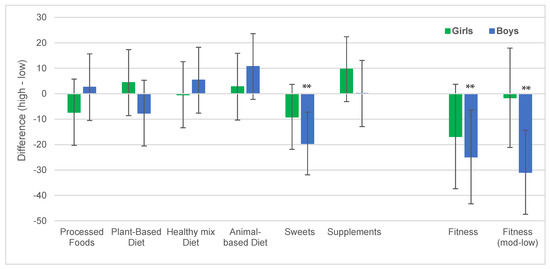 Differences in BMIPCT between high and low dietary factor scores and high and low and as well as moderate and low fitness scores among girls and boy. Values are mean differences with 95% CI. ** significant difference at p < 0.01.
