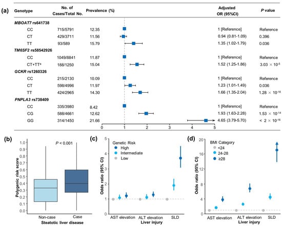 Effects of genetic factor and BMI category on the risk of steatotic liver disease and liver enzyme elevation in the HOPE cohort. (a) Associations between individual SNPs and SLD. (b) Polygenic risk scores among SLD cases versus non-cases. In the boxplot, the median is represented by horizontal lines, the interquartile range is indicated by the upper and lower edges of the box, and the whiskers display the maximum and minimum values for each group. The p value was derived from the Mann–Whitney U test, and p < 0.001 indicates that the difference in the polygenic risk score distribution between the case group and the non-case group was statistically significant. (c) Associations of genetic risk categories with liver injuries. (d) Associations of BMI categories with liver injuries. Genetic risk groups were established based on the tertiles of the PRS (low, intermediate, and high). ORs and 95% CIs were determined after controlling for age, sex, smoking status, drinking status, education level, regular physical activity, hypertension, diabetes, hyperlipidemia, BMI (SNP and genetic risk analysis), or genetic risk (BMI category analysis). a Because only 39 participants had the TM6SF2 rs58542926 TT genotype, the CT and TT genotypes were combined into one explanatory variable, “CT+TT”. OR, odds ratio; 95% CI, 95% confidence interval; SLD, steatotic liver disease; BMI, body mass index; ALT, alanine aminotransferase; AST, aspartate aminotransferase; SNPs, single-nucleotide polymorphisms.
