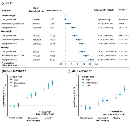 As the PRS and BMI groups were combined, the SLD and liver enzyme elevation risk grew as both factors rose (Figure 2). Among all of the categories analyzed, individuals with both a high genetic risk and obesity exhibited the highest liver injury risk. Compared with those with a low genetic susceptibility to SLD and normal weight, having a high genetic risk and obesity was linked to an increased risk of SLD (OR: 63.16, 95% CI: 40.86–97.64), ALT elevation (OR: 9.21, 95% CI: 6.96–12.18), and AST elevation (OR: 5.10, 95% CI: 3.86–6.82). Moreover, the risk of SLD and aminotransferase elevation remained consistently lower in individuals with a normal weight than in those with obesity, within each category of genetic risk. Significant interactions between the genetic risk and BMI categories regarding aminotransferase elevation were observed (p for interaction = 0.007 for ALT elevation; p for interaction = 9.39×10−7 for AST elevation), indicating that the risk-increasing effect of the genetic risk on aminotransferase elevation was amplified by increasing adiposity. However, no significant interaction was found between the PRS and BMI categories for SLD (p for interaction = 0.933).