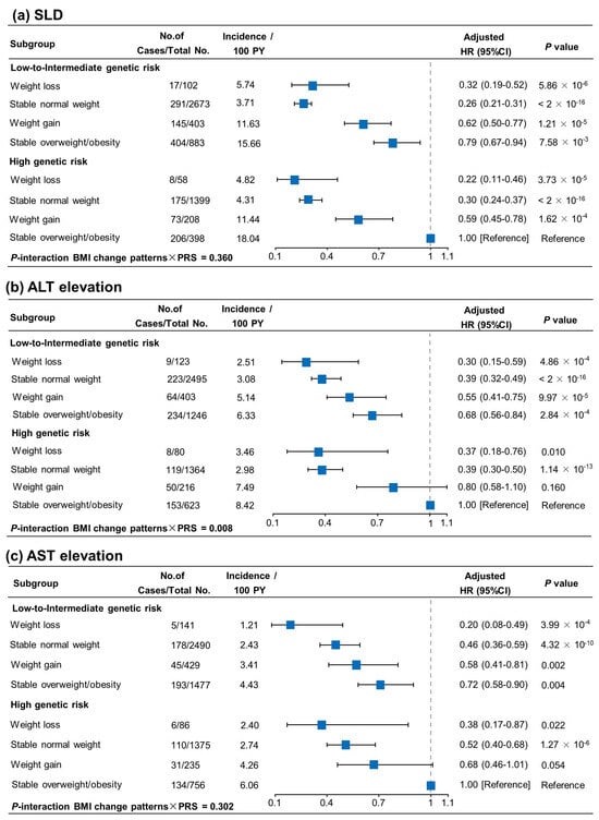 The tendencies of the risk of SLD and aminotransferase elevation among participants with different BMI change patterns and genetic risks of SLD are presented in Figure 3. As compared with those with stable overweight/obesity and a high genetic risk, weight loss was associated with a 78% (HR 0.22, 95% CI, 0.11–0.46) lower risk of SLD among those at a high genetic risk, and a stable normal weight was associated with a 70% (HR 0.30, 95% CI, 0.24–0.37) lower risk of SLD among those at a high genetic risk. Likewise, individuals experienced a gradually decreased liver enzyme elevation risk across the four BMI change patterns in both the low-to-intermediate- and high-genetic-risk categories. An interaction between the BMI change patterns and PRS was observed only for ALT elevation (p for interaction = 0.008).