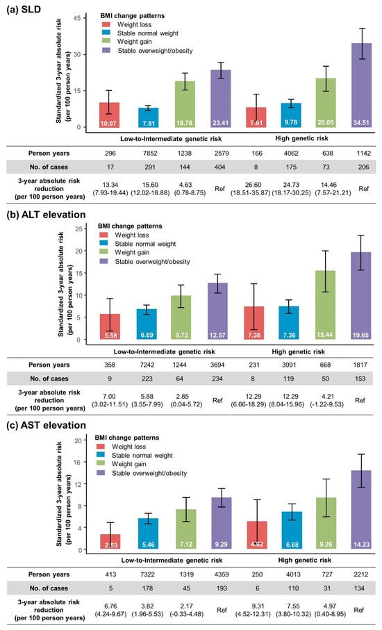 Standardized 3-year absolute risk (per 100 person years) for SLD (a), ALT elevation (b), and AST elevation (c) according to BMI change patterns in different genetic risk groups. The 3-year absolute risks were age- and sex-adjusted. Genetic risk was classified into low-to-intermediate (tertiles 1–2) and high (the top tertile) based on the tertiles of the polygenic risk score. Error bars represent 95%CI of 3-year absolute risk. The HRs were obtained using Cox proportional-hazards regression with adjustment for age, sex, smoking status, drinking status, education level, regular physical activity, hypertension, diabetes, and hyperlipidemia.