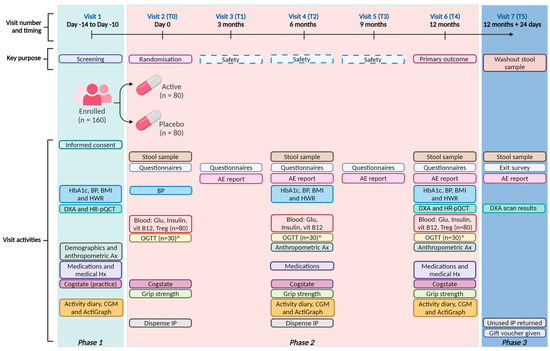 - Perraudeau, F.; McMurdie, P.; Bullard, J.; Cheng, A.; Cutcliffe, C.; Deo, A.; Eid, J.; Gines, J.; Iyer, M.; Justice, N.; et al. Improvements to postprandial glucose control in subjects with type 2 diabetes: A multicenter, double blind, randomized placebo-controlled trial of a novel probiotic formulation. BMJ Open Diabetes Res. Care 2020, 8, e001319. [Google Scholar] [CrossRef]