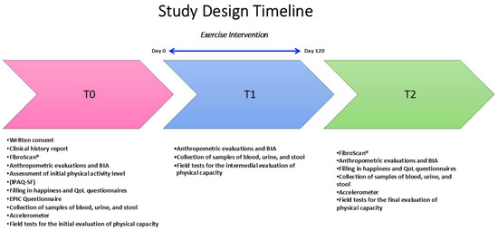 Study design timeline. BIA: Bioelectrical Impedance Analysis; IPAQ-SF: International Physical Activity Questionnaire-Short Form; QoL: Quality of Life; EPIC: European Prospective Investigation into Cancer and Nutrition; T0: Initial Evaluation; T1: Intermedial Evaluation; T2: Final Evaluation.