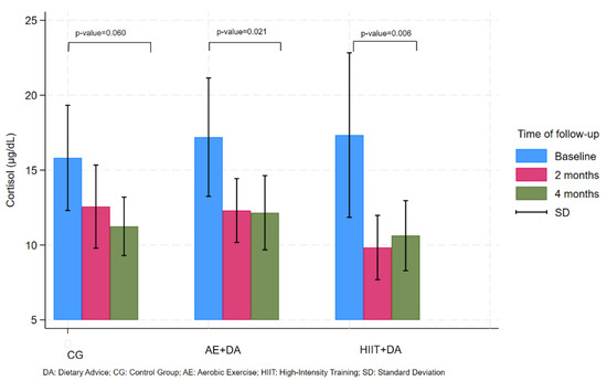At the end of the study, serum cortisol levels had decreased in all treatment groups. Both the AE + DA and HIIT + DA groups showed a statistically significant decrease (p-value 0.021), with an initial mean of 17.20 (6.22) falling to a final mean of 12.16 (3.22) and a p-value of 0.006, and with an initial mean of 17.34 (9.09) falling to a final mean of 10.63 (3.87), respectively.