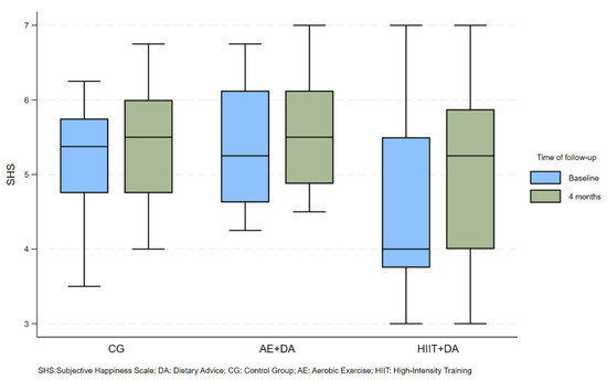The box plot (Figure 4) shows the development of the SHS value over time, as shown in Table S1. The median value of the happiness questionnaire increased slightly over time in the CG and AE + DA groups, whereas the change was more pronounced in the HIIT + DA group. However, it should be noted that the observed differences were not statistically significant.