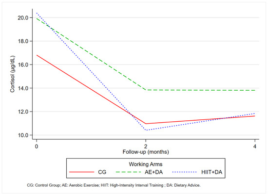 The longitudinal trajectories of cortisol levels by working arms are shown in Figure 4.