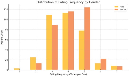 The distribution of food frequency differed significantly between males and females (p = 0.0018). The most common food frequency category for both sexes was 4–5 times a day, for 54.7% of males and 64.7% of females. However, a significant higher percentage of males reported eating 1–3 times per day (39.3% vs. 27.5% of females), while females showed a slight increase in the 6+ times per day category compared to males (Figure 1).