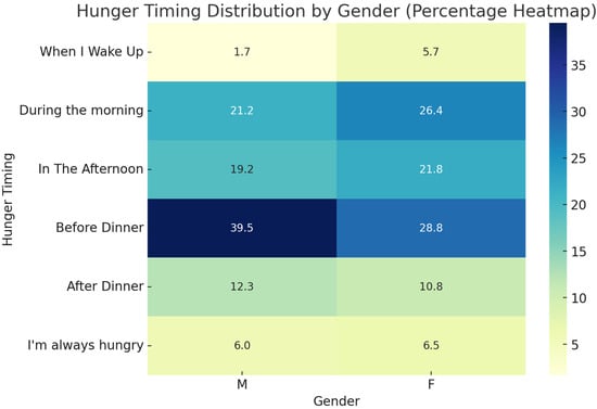 Hunger timing distribution by gender. This heatmap illustrates the percentage distribution of self-reported hunger times among male and female participants at different times of day. The categories include ‘When I wake up’, ‘During the morning’, ‘In the afternoon’, ‘Before dinner’, ‘After dinner’ and ‘I am always hungry’. Statistical differences between genders were assessed using the chi-square test, yielding significant results (χ2 = 16.58, p = 0.0054).