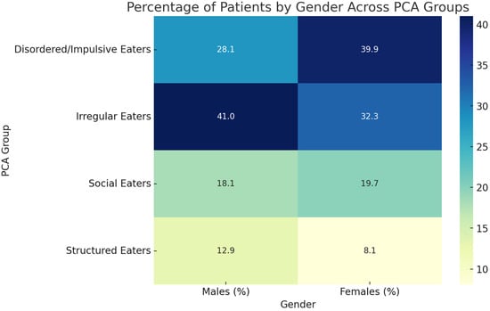 The analysis revealed that the gender distribution between the PCA groups was statistically significant (p = 0.0016). Irregular eaters were the largest group, comprising 41.0% of males and 32.3% of females (Figure 3). In contrast, females predominated in the disordered/impulsive eaters group (39.9% vs. 28.1% for males). Social eaters and structured eaters are smaller groups overall, with a slightly higher proportion of females in social eaters and males in structured eaters (Figure 3).