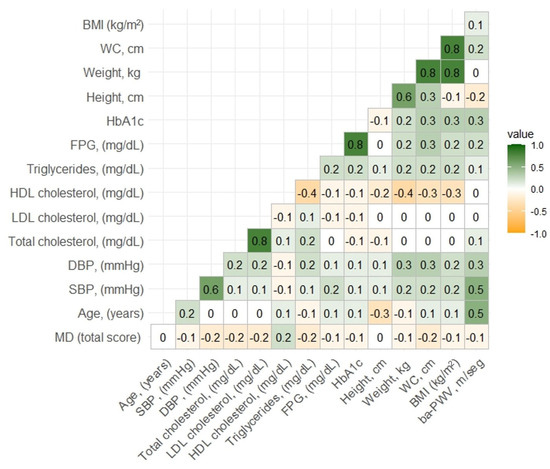 The following equation was used to estimate ba-PWV: ba-PWV = ((0.5934 × height (cm) + 14.4724))/tba, where tba is the transmission time of the waves to the ankle [43,44]. For this study, the mean value of the two extremities of ba-PWV was taken into account.