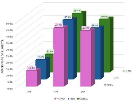 Table 2 shows the differences in the total sample in the MD, cardiovascular risk factors and drugs used in the subjects according to their degree of aging. An amount of 14% of the sample (n = 475) was classified as HVA, 45% (n = 1559) was classified as NVA and the remaining 41% (n = 1403) was classified as EVA (Figure 3). The mean age for subjects in the HVA group was 59.39 ± 10.34 (60.28 ± 9.30 for men and 57.93 ± 11.73 for women), for the NVA group it was 60.33 ± 9.78 (60.34 ± 9.60 for men and 60.31 ± 10.04 for women) and for the EVA group it was 60.22 ± 8.98 (60.02 ± 9.29 for men and 60.47 ± 8.59 for women). For the ba-PWV variable, a lower velocity was observed for the HVA group with values of 11.60 ± 1.34 (11.91 ± 1.17 for men and 11.08 ± 1.45 for women) than in the NVA group with values of 13.45 ± 1. 69 (13.59 ± 1.43 for men and 13.25 ± 1.99 for women) and the EVA group with values of 16.36 ± 2.57 (16.52 ± 2.49 for men and 16.18 ± 2.67 for women) being significant in all cases (p < 0.001).