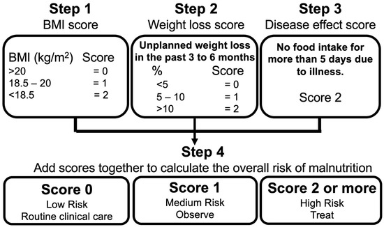 - Stratton, R.J.; Hackston, A.; Longmore, D.; Dixon, R.; Price, S.; Stroud, M.; King, C.; Elia, M. Malnutrition in hospital outpatients and inpatients: Prevalence, concurrent validity and ease of use of the ‘malnutrition universal screening tool’ (‘MUST’) for adults. Br. J. Nutr. 2004, 92, 799–808. [Google Scholar] [CrossRef]