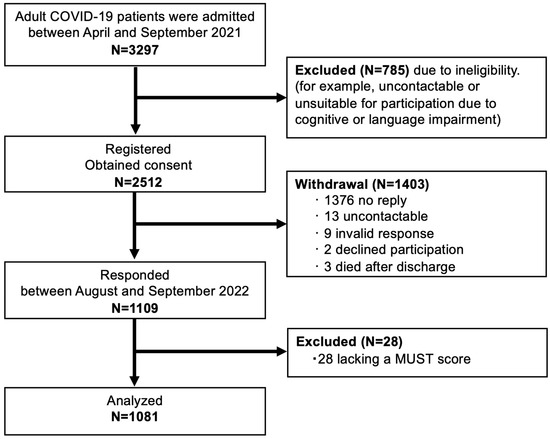 Between 1 April 2021 and 30 September 2021, 3297 COVID-19 patients were enrolled across the participating centers. Of these patients, 785 were excluded due to ineligibility and, thus, 2512 were included in this study. However, by the 1-year follow-up, 1403 patients had dropped out (1376 did not respond, 13 were unreachable, and 3 had died). A total of 1109 patients completed the self-administered questionnaire one year post-illness. Of these patients, 27 were excluded from the nutritional assessment due to incomplete data on BMI or weight loss. Consequently, 1081 patients were included in the final analysis (Figure 3). The mean age of participants was 55.9 ± 13.5 years, with 718 (66%) being male. The mean BMI was 26.3 ± 5.5 kg/m2. Among the 1081 patients, 411 (38.0%) were admitted to the ICU, 342 (31.6%) received invasive positive pressure ventilation, and 41 (3.8%) required treatment with ECMO. The mean length of hospital stay was 15.8 ± 19.9 days.