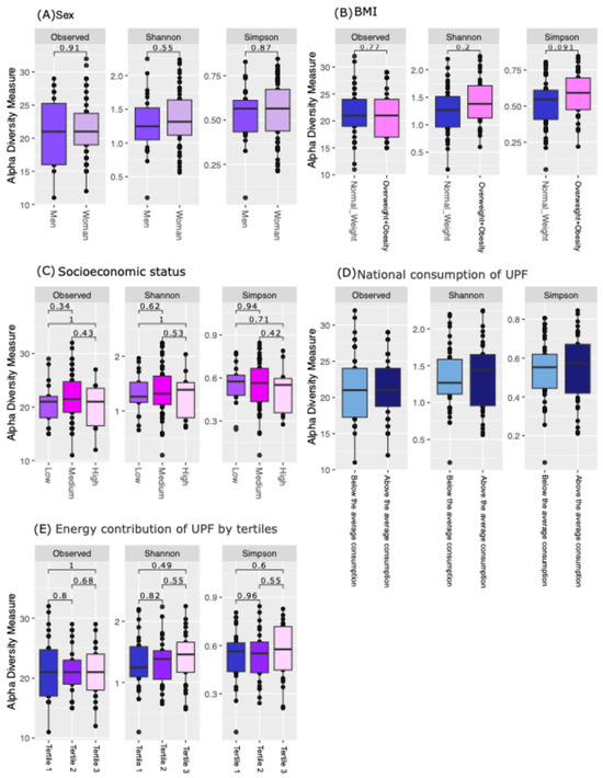 Distribution of alpha diversity metrics (observed ASVs, Shannon, Simpson). (A) Sex, (B) BMI, (C) SES, (D) national consumption of UPF, (E) energy contribution of UPF by tertiles.