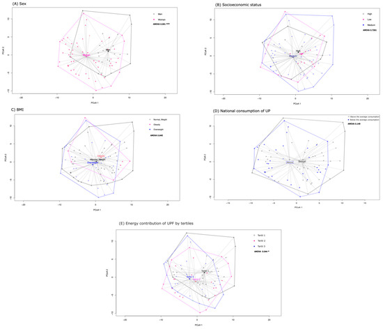 Beta diversity (Atkinson distance). (A) Sex, (B) SES, (C) BMI, (D) national consumption of UPF, and (E) energy contribution of UPF by tertiles. The points on the graph represent the bacterial communities of each subject, with points closer together indicating more similar bacterial communities.