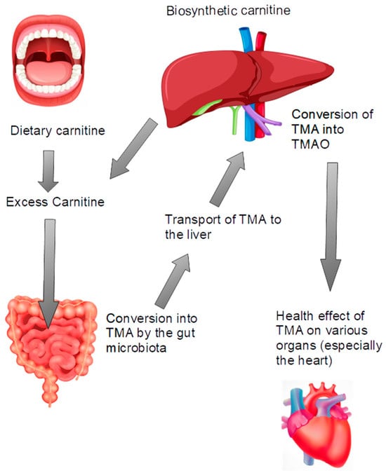 A recent area of interest for carnitine is the interaction between carnitine and the gut microbiota. Gut microbes metabolize carnitine into trimethylamine (TMA) [], which is absorbed by enterocytes and converted into trimethylamine-N-oxide (TMAO) in the liver []. Elevated TMAO levels have been linked to an increased risk of cardiovascular diseases, indicating a complex relationship between carnitine intake and health outcomes [,] (Figure 1).