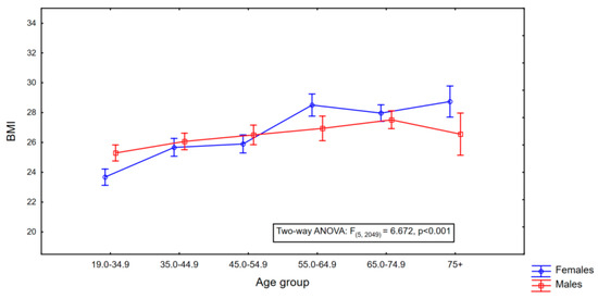 Sex- and age-related differences in mean body mass index (BMI) among a sample of Polish adults. The midpoints represent the mean BMI values for each age group, and the vertical lines indicate the 95% confidence intervals.