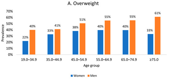 The analysis of the prevalence of being overweight and being obese measured by BMI categories in age groups showed that the prevalence of excess body weight increased with the age of the respondents until the age of 64.9, when it reached the value of 73.1% and decreased slightly in senior age. In all age groups, men were more likely than women to be overweight. However, women with obesity were significantly more likely than men (except for people aged 35.0–44.9 years) when the difference did not show statistical significance (Table 4). Analyzing the prevalence of excess body weight in seniors based on the Lipschitz criteria, the percentage of people with BMI > 27 kg/m2 exceeded 50%, except for the oldest men, in whom excess body weight occurred less frequently and affected 44.4% of people.