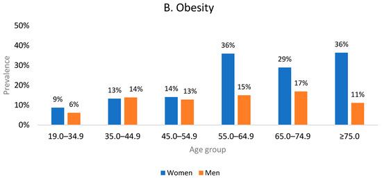 The percentage of adults with obesity in Poland up to 55 years of age in the analyzed age groups was at a maximum of 14.1% in the group of women aged 45–54.9 years and 13.9% in the group of men aged 35–44.9 years. In the following decades of life, in the group of men, the prevalence of obesity increased to 16.8% (age 65.0–74.9 years) and decreased to 11.1% in the oldest seniors. Women aged 55 and older struggled with obesity much more often than men; this was especially true for women aged 55–64.9 and seniors aged ≥75, where obesity exceeded 36%. Th overweight status, in turn, dominated in the group of men. The highest percentage of overweight men (61.1%) was recorded in the group of the oldest seniors. In the group of women, the most overweight people (39.7%) were aged 55.0–64.9.