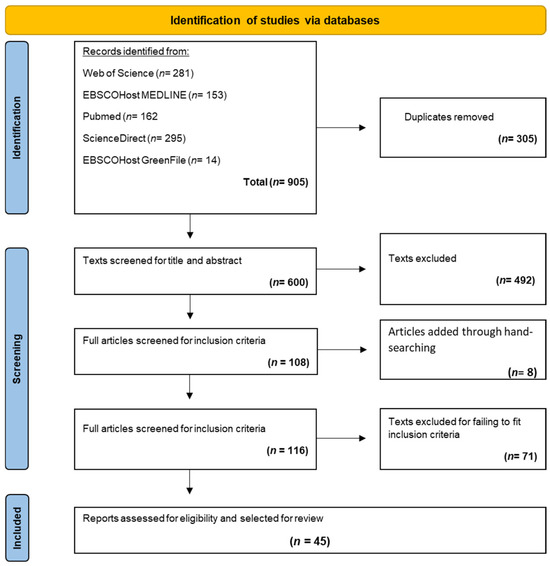 Search terms (Table 1) derived from the review’s objective were used as part of the online database advanced search strategy. The databases searched were Web of Science, ScienceDirect, EBSCOHost, GreenFile, EBSCOHost MEDLINE, and PubMed. The searches were conducted in January 2023.