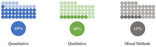 Regarding methods, eight used qualitative methods, thirty-one used quantitative methods, and six used a mixed-methods approach (Figure 4).