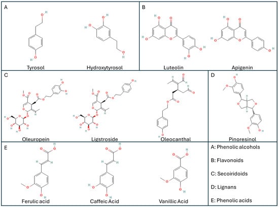 The antioxidant activity of phenolic compounds is primarily due to their ability to donate hydrogen atoms to free radicals, thus terminating the chain reaction of lipid oxidation. This action stabilizes the phenoxyl radicals formed during the reaction, enhancing the overall antioxidant capacity of EVOO [85]. The phenolic compounds in EVOO act as chain-breaking antioxidants. They inhibit the oxidation of lipids and other biomolecules, which is crucial for preventing chronic diseases associated with oxidative stress. The presence of hydroxyl groups in these compounds enhances their ability to scavenge free radicals [85,86]. EVOO consumption has been associated with reduced levels of inflammatory markers. The phenolic compounds can inhibit the expression of pro-inflammatory cytokines and enzymes, such as COX-2, thereby mitigating chronic inflammation [84]. Furthermore, oleocanthal shares a chemical structure with non-steroidal anti-inflammatory drugs, such as ibuprofen, which allows us to hypothesize that EVOO compounds could directly inhibit COX-2 [87].