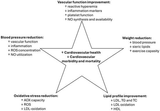 Shared effects of resveratrol and EVOO. Note: EVOO—extra virgin olive oil; ROS—reactive oxygen species; NO—nitric oxide; LDL—low density lipoproteins; TG—triglycerides; TC—total cholesterol; AOX—antioxidant; ↑—improvement; ↓—decrease.