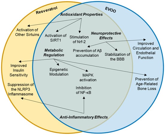 Resveratrol and EVOO are both celebrated for their health benefits, particularly in the context of aging and age-related diseases. This discussion highlights their shared protective effects, mechanisms of action, and the scientific evidence supporting their roles in promoting health and longevity. Both resveratrol and EVOO are rich in antioxidants, which play a crucial role in combating oxidative stress—a significant contributor to aging and various chronic diseases. This polyphenolic compound is known for its potent antioxidant activity, which helps neutralize free radicals and reduce oxidative damage to cells. Studies have shown that resveratrol can enhance the body’s natural antioxidant defenses, leading to improved cellular health and longevity [1,29]. Particularly high in phenolic compounds such as hydroxytyrosol and oleuropein, EVOO also exhibits strong antioxidant properties. These compounds help protect against oxidative stress by scavenging free radicals and reducing inflammation, which are vital for maintaining cellular integrity and function [82,84,85].