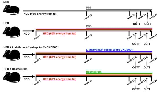 Overview of experimental design. Four-week-old male C57BL/6J mice (n = 12 per group) were subjected to the following dietary interventions for 24 weeks: normal chow diet (NCD), high-fat diet (HFD), HFD with L. delbrueckii subsp. lactis CKDB001 (LL), and HFD with resmetirom (positive control). Abbreviation: HFD, High-fat diet; LL, L. delbrueckii subsp. lactis CKDB001; NCD, normal chow diet; OGTT, Oral glucose tolerance test; OLTT, Oral lipid tolerance test; PBS, Phosphate buffered saline.