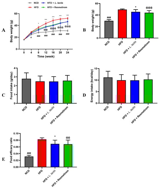 Effects of L. delbrueckii subsp. lactis CKDB001 on the body weight, final body weight, daily feed intake, energy intake, and food efficiency ratio of mice. The mice were subjected to the following dietary interventions for 24 weeks: normal chow diet (NCD), high-fat diet (HFD), HFD with L. delbrueckii subsp. lactis CKDB001 (LL), and HFD with resmetirom (positive control). (A) Weekly body weight over 24 weeks induced by HFD; (B) final body weight; (C) daily food intake; (D) energy intake; (E) food efficiency ratio. Values are presented as mean ± standard deviation (SD), and organ weights are expressed as a percentage of body weight (% of BW). # p < 0.05, ### p< 0.0001 between NCD and HFD; * p < 0.05, *** p < 0.001 between HFD and LL; @@ p < 0.01, @@@ p < 0.001 between HFD and PC.