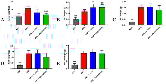 Effects of L. delbrueckii subsp. lactis CKDB001 on mouse organ weights. The mice were subjected to the following dietary interventions for 24 weeks: normal chow diet (NCD), high-fat diet (HFD), HFD with L. delbrueckii subsp. lactis CKDB001 (LL), and HFD with resmetirom (positive control). (A) Liver, (B) EAT, (C) SAT, (D) MAT, and (E) WATs weights. Values are presented as mean ± standard deviation (SD). ### p < 0.001 between NCD and HFD; ** p < 0.01, *** p < 0.001 between HFD and LL; @@ p < 0.01, @@@ p < 0.001 between HFD and PC. Abbreviation: EAT, epididymal adipose tissue; SAT, subcutaneous adipose tissue; MAT, mesenteric adipose tissue; WAT, white adipose tissue.