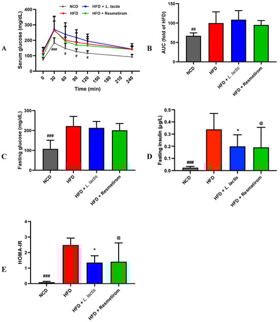 Effects of L. delbrueckii subsp. lactis CKDB001 on serum glucose levels of mice. The mice were subjected to the following dietary interventions for 24 weeks: normal chow diet (NCD), high-fat diet (HFD), HFD with L. delbrueckii subsp. lactis CKDB001 (LL), and HFD with resmetirom (positive control). (A) Serum glucose; (B) AUC of OGTT; (C) fasting glucose; (D) fasting insulin; (E) HOMA-IR. Values are presented as mean ± standard deviation (SD). # p < 0.05, ## p < 0.01, ### p < 0.001 between NCD and HFD; * p < 0.05 between HFD and LL; @ p < 0.05 between HFD and PC. Abbreviation: AUC, area under the curve; OGTT, oral glucose tolerance test; HOMA-IR, homeostasis model assessment-estimated insulin resistance.
