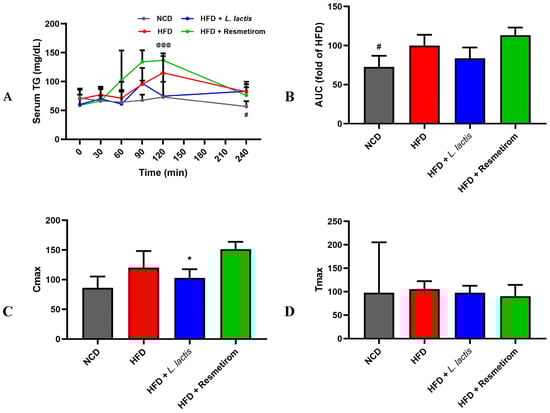 To determine whether LL prevents hyperlipidemia induced by an HFD, we conducted OLTTs. The results showed that blood lipid levels were significantly higher in the HFD group compared with those in the NCD group. Although the LL group showed 0.90-fold lower blood lipid levels than those in the HFD group, the difference did not reach statistical significance (Figure 5A,B). Additionally, Cmax was 0.80- and 0.95-fold lower in the NCD and LL groups, respectively, than in the HFD group, but these differences were also not significant. However, the PC group exhibited a 1.39-fold higher Cmax than that of the HFD group (Figure 5C). The Tmax was similar across all groups, with no notable differences (Figure 5D).
