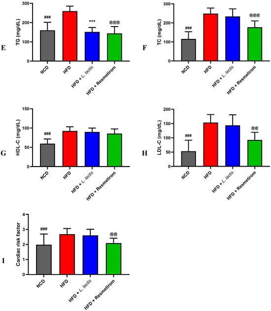 Effects of L. delbrueckii subsp. lactis CKDB001 on serum TC, TG, HDL-c, LDL-c, and CRF in mice. The mice were subjected to the following dietary interventions for 24 weeks: normal chow diet (NCD), high-fat diet (HFD), HFD with L. delbrueckii subsp. lactis CKDB001 (LL), and HFD with resmetirom (positive control). (A) Serum TG; (B) AUC of OLTT; (C) Cmax; (D) Tmax; (E) TG; (F) serum TC; (G) serum HDL-cholesterol; (H) serum LDL-cholesterol; (I) cardiac risk factor. Values are presented as mean ± standard deviation (SD). # p < 0.05, ### p < 0.001 between NCD and HFD; * p < 0.05, *** p < 0.001 between HFD and LL; @@ p < 0.01, @@@ p < 0.001 between HFD and PC. Abbreviation: TG, triglyceride; AUC, area under the curve; OLTT, oral lipid tolerance test; TC, total cholesterol; HDL, high-density lipoprotein; LDL, low-density lipoprotein.