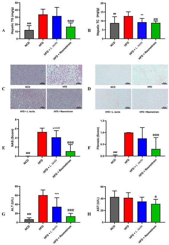 Effects of L. delbrueckii subsp. lactis CKDB001 on serum hepatic TG, hepatic TC, histology, NAS, fibrosis, ALT, and AST levels of mice. The mice were subjected to the following dietary interventions for 24 weeks: normal chow diet (NCD), high-fat diet (HFD), HFD with L. delbrueckii subsp. lactis CKDB001 (LL), and HFD with resmetirom (positive control). (A) Hepatic TG; (B) hepatic TC. (C) H&E and (D) sirius red staining images of the liver. (E) NAS; (F) hepatic fibrosis; (G) serum ALT; (H) serum AST. Values are presented as mean ± standard deviation (SD). ## p < 0.01, ### p < 0.001 between NCD and HFD; ** p < 0.01, *** p < 0.001 between HFD and LL; @ p < 0.05, @@ p < 0.01, @@@ p < 0.001 between HFD and PC. Abbreviations: TG; triglyceride, TC; total cholesterol, H&E; hematoxylin and eosin, NAS; NAFLD activity score, ALT; alanine aminotransferase, AST; aspartate aminotransferase.