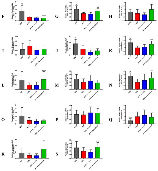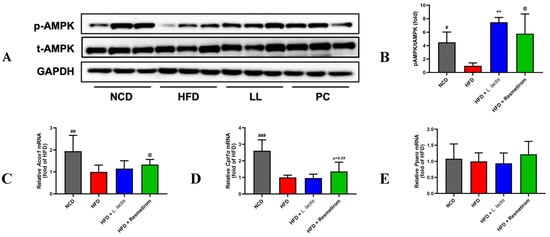 The HFD-induced metabolic disturbances in energy and lipid metabolism in the liver may lead to various pathological progressions []. However, LL treatment significantly mitigated HFD-induced metabolic disturbances; therefore, we logically postulated that LL treatment would also alter energy and lipid metabolism beneficially. Therefore, the expression levels of energy and lipid metabolism-related biomarkers in the liver were measured following HFD intake. The p-AMPK levels in the liver were 4.50-fold lower in the HFD than in the NCD group (p < 0.05; Figure 7A,B). Notably, LL and PC treatments resulted in 7.47- (p < 0.001) and 5.79-fold (p < 0.05) higher p-AMPK levels, respectively, compared with those in the HFD group (Figure 7A,B). Additionally, the expression levels of genes involved in fatty acid β-oxidation were measured to determine the effects of LL on lipid metabolism. Anabolic gene expression related to de novo ectopic adipogenesis, including Acox1, Cpt1α, Pparα, Pgc1α, Acc, Fas, Srebp1c, Scd1, and Dgat1, was measured by qRT-PCR. The HFD groups exhibited significantly lower expressions of adipogenic genes, such as Acox1, Cpt1α, Pgc1α, Acc, Scd1, and Dgat1, reaching levels as low as 51.5%, 38.3%, 38.0%, 63.0%, 54.5%, and 59.3%, respectively, compared to those in the NCD group (Figure 7C–K). Interestingly, among the anabolic gene expressions, hepatic Scd1 expression in the LL group was significantly decreased compared to the HFD group (Figure 7J). Furthermore, hepatic Srebp1c expression in the LL group (~54%) was significantly lower than in the HFD group, which was elevated by HFD consumption compared to the NCD, Il-6, Tnf- α, Hmgcoa reductase, and Ldlr in the liver were analyzed by qRT-PCR (Figure 7J,P,Q,S). However, LL did not significantly alter lipolysis, cytokine, or cholesterol regulatory gene expressions. These results suggest that LL treatment significantly improves p-AMPK levels and influences gene expression associated not with catabolic, but with anabolic responses in lipid metabolism, including lipid synthesis. Our findings imply potential therapeutic benefits in managing HFD-induced metabolic disturbances in the liver.