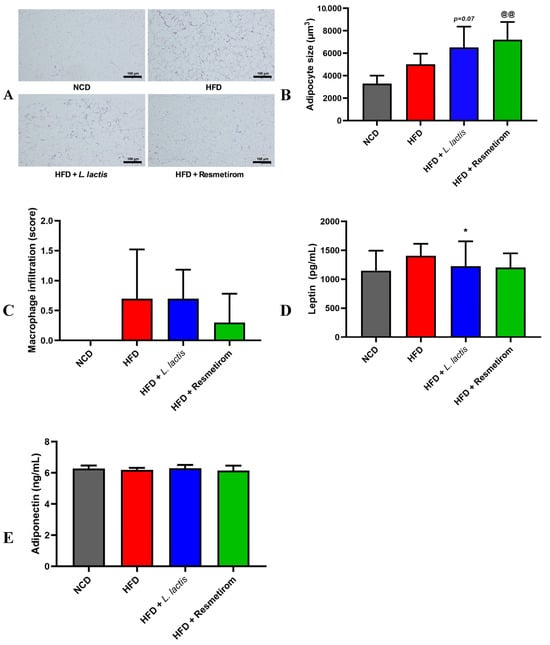 Effects of L. delbrueckii subsp. lactis CKDB001 on mouse lipid metabolism. The mice were subjected to the following dietary interventions for 24 weeks: normal chow diet (NCD), high-fat diet (HFD), HFD with L. delbrueckii subsp. lactis CKDB001 (LL), and HFD with resmetirom (positive control). (A) H&E staining image of EAT. (B) Adipocyte size in EAT. (C) Macrophage infiltration; (D) Leptin; (E) Adiponectin. Values are presented as mean ± standard deviation (SD). * p < 0.05 between HFD and LL; @@ p < 0.01 between HFD and PC. Abbreviation: H&E staining image of EAT; EAT, epididymal adipose tissue.