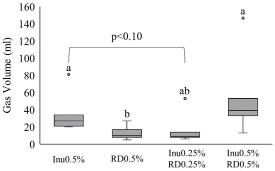 The gas production in the Inu0.5% group and Inu0.5%RD0.5% combination group was significantly higher than that in the RD0.5% group (p < 0.05, Figure 1). Additionally, the gas production in the Inu0.25%RD0.25% combination group was lower than that in the Inu0.5% group (p < 0.10).