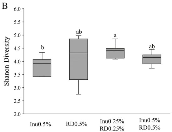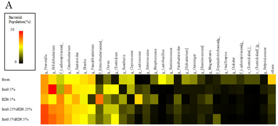 The bacterial composition differed among the groups (Figure 2A). The proportion of Bifidobacterium was highest in the Inu0.5% group (26.1%), followed by that in the Inu0.5%RD0.5% combination group (17.7%), the Inu 0.25%RD0.25% combination group (15.1%), and the RD0.5% group (5.8%). Additionally, the Prevotella genus proportion was higher in the combination groups than in the prebiotic alone groups. The microbiota diversity (α-diversity: Shannon index) was the lowest in the Inu0.5% group; the diversity in the Inu0.25%RD0.25% combination group was significantly higher than that in the Inu0.5% group (p < 0.05, Figure 2B).