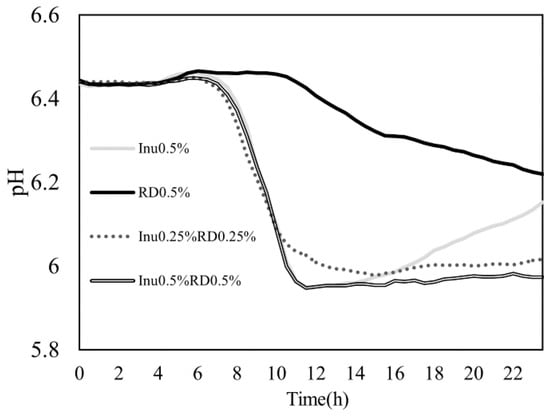 Changes in the pH of the fermentation medium during the 24 h fermentation process. Values are presented in terms of the mean (n = 7). Inu0.5%, RD0.5%, RD0.25%Inu0.25%, and RD0.5%Inu0.5% are depicted using a light gray line, a black line, a dotted line, and double lines, respectively.