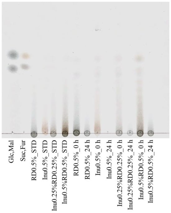 Thin-layer chromatography (TLC) showing the resistant dextrin and inulin degradation in the fecal fermentation supernatants at 0 (0 h) and 24 (24 h) h after fermentation. A representative sample image is shown. Glucose (Glc), maltose (Mal), sucrose (Suc), and fructose (Fur) spots are size markers. The standard (STD) was prepared by dissolving each prebiotic in distilled water.