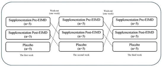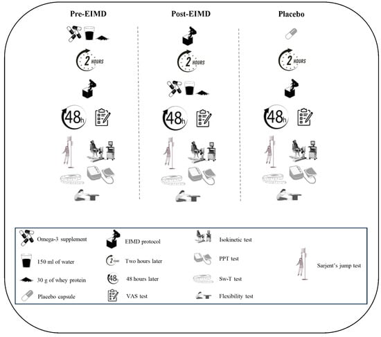 This study was conducted in a randomized, cross-over, placebo-controlled, and double-blind design (Figure 1). To ensure consistency, participants attended an initial familiarization session where they were introduced to all testing protocols and procedures, including specific familiarization with the Biodex device and the isokinetic strength test. Each participant underwent three distinct conditions across different sessions: (i) pre-EIMD supplementation (1000 mg fish oil and 30 g whey protein, n = 5), administered 2 h before EIMD; (ii) post-EIMD supplementation (1000 mg fish oil and 30 g whey protein, n = 5), administered within 2 h following EIMD; and (iii) placebo (PLA, four capsules containing 2 g starch, n = 5 (see Figure 2)). In each condition, participants were randomly allocated to one of the intervention arms (5 participants per condition). To clarify, all 15 participants completed each intervention condition in separate experimental sessions, amounting to three unique trials per participant (see Figure 2). The experimental sessions were separated by a one-week washout period to eliminate carryover effects. Delayed onset muscle soreness (DOMS) was assessed using a visual analog scale (VAS) before testing and at 0, 12, 24, and 48 h post-EIMD. Additionally, 48 h post-EIMD, measurements were taken for thigh swelling (Sw-T), pressure pain threshold (PPT), vertical jump height (VJH), V-sit and reach flexibility test (VSFT), range of motion (ROM), and both isokinetic and isometric strength tests. Before each test, participants were asked to abstain from omega-3-rich dietary sources for 24 h to avoid confounding effects. Previous research indicates that the menstrual cycle can significantly influence exercise performance in women [35]. Supplementation and functional tests were conducted during the follicular phase to minimize the effect of hormonal variations occurring during the menstrual cycle on the measured variables. The menstrual cycle phase for each participant was determined using the Menstrual Cycle Questionnaire, and participants with similar cycle timings were selected for the study [36]. Furthermore, all female participants were naturally menstruating and not utilizing any contraceptive methods.