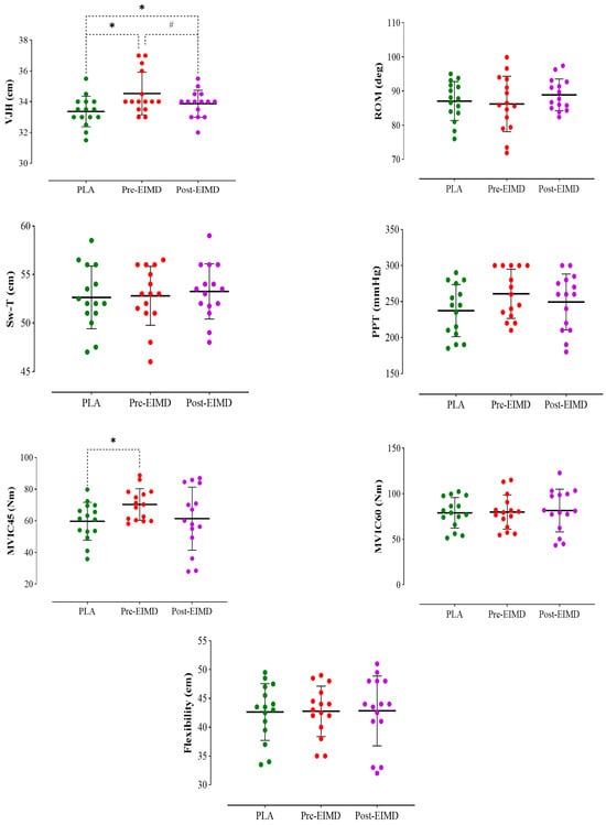 Means and standard deviations of VJH, ROM, MVIC45, MVIC60, Sw-T, PPT, and Flexibility across three conditions. Laboratory experiments were conducted three times, with n = 15 participants total and n = 5 per group (PLA, pre-EIMD, post-EIMD) in each experiment. p-values were calculated using repeated measures analysis of variance (ANOVA) with Bonferroni post hoc tests. *: significant difference compared to PLA. #: significant difference compared to pre-EIMD.