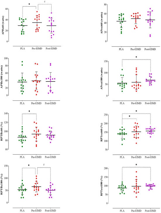 Additionally, the analysis indicated a significant main effect on APext180°/s (F = 3.500, p = 0.044, pη2 = 0.200), with APext180°/s showing an increase during post-EIMD in comparison to PLA (p = 0.023). Nevertheless, no significant differences were found between APext180°/s in post-EIMD and pre-EIMD (p = 0.436), or between pre-EIMD and PLA (p = 1.000) (Figure 4).