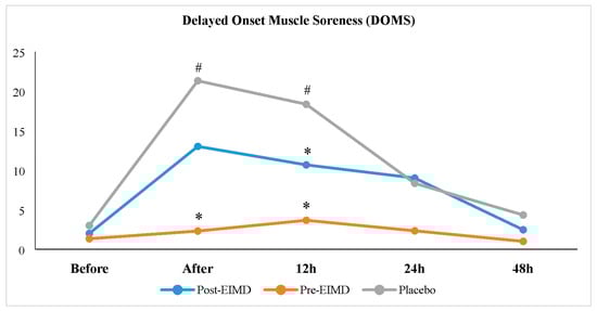 Changes in average delayed onset muscle soreness (DOMS) at different time points (immediate, 12 h, 24 h, and 48 h post-EIMD) across three conditions. p-values were calculated using mixed repeated measures ANOVA with Bonferroni post hoc tests. *: significant difference compared to PLA. #: significant difference compared to DOMS before EIMD.