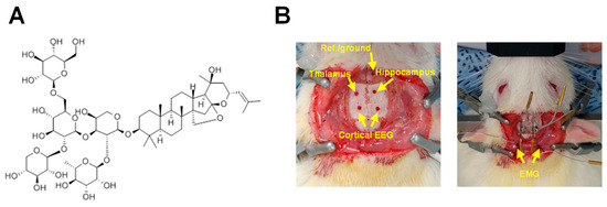Chemical structure of jujuboside A compound (A) and schematic diagrams (B) of electrode placement for EEG/EMG recording and reference in the rat skull. The electrode implantation surgery was performed according to the following schematic. Electrodes and screws were inserted into the local field potential (LFP) of the left thalamus, LFP of the right hippocampus, reference/ground, bilateral cortical EEG, and two EMGs. EEG, electroencephalogram; EMG, electromyogram; LFP, local field potential.