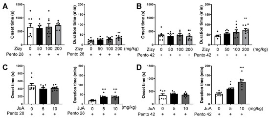 Effects of Zizy extract and JuA on sleep onset and sleep duration in pentobarbital-treated mice. The effect of Zizy extract (A,B) and JuA (C,D) on sleep onset and sleep duration was evaluated at subhypnotic (A) and hypnotic (B) concentrations of pentobarbital. The mice were orally administered Zizy extract at each concentration (50, 100, 200 mg/kg) or intraperitoneally administered JuA at each concentration (5, 10 mg/kg), 1 h and 25 h before the intraperitoneal administration of pentobarbital. Mice were fasted during the 24 h interval between Zizy extract administration. Data are expressed as the mean ± SEM (n = 8–9) and were analyzed by one-way ANOVA followed by Tukey’s post hoc test. * p < 0.05, ** p < 0.01, and *** p < 0.001 compared with the pentobarbital only group. Zizy, Zizyphi Semen extract; JuA, jujuboside A; Pento, pentobarbital.